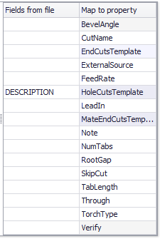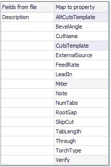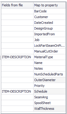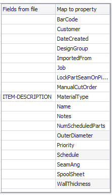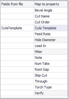 Drag a field from the "Fields in file" column to a row in the "Map to property" column where it will be mapped to that property for the part or cut.