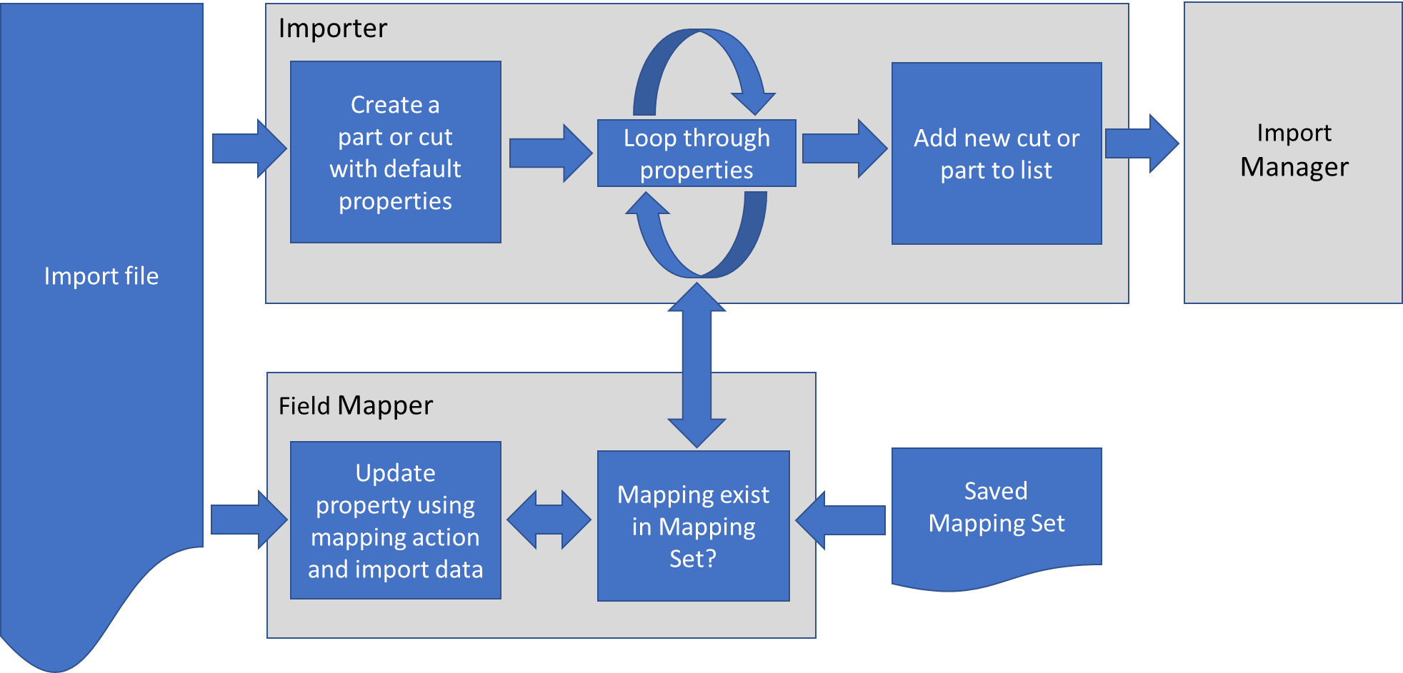 During import time, whenever a part or cut is created the Field Mapper will update the properties of that part or cut using the active field mappings that were set earlier. The update action can either copy the incoming data to the property, parse the incoming data using one or more regular expressions, or invoke a custom action.