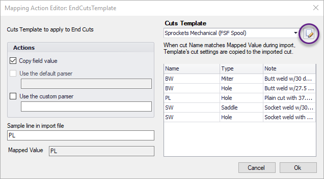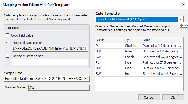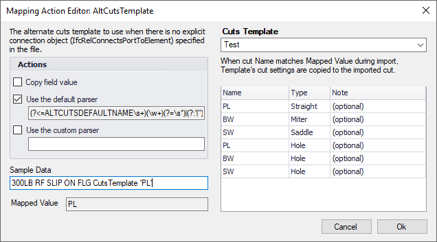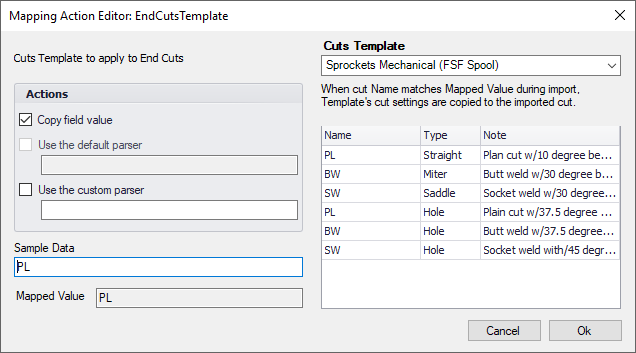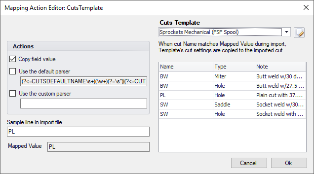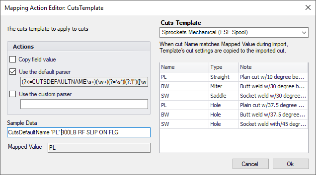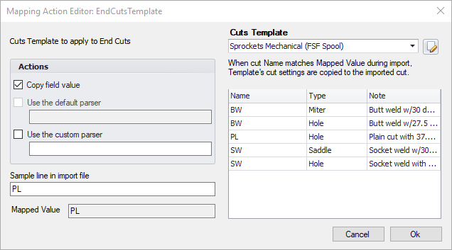 Custom actions perform a complex transformation of incoming data. A "Cuts Template" is an example of a custom action. A cuts template action applies a set of values to an imported cut using a special part which contains a set of template cuts. When a that part's cut name and type match the mapped data then the values from that cut in the template are applied onto the imported cut.