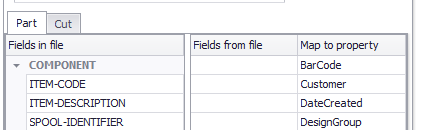 Associating a "Field in file" to a Part or Cut value is called "mapping" and is done by dragging Field Names between the "Fields in file" and "Fields from file" columns.