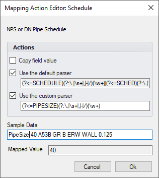 Use scenario: The ITEM-DESCRIPTION field from the PIPE component has the NPS Schedule embedded in it using a common industry pattern of "SCH xx". The schedule value needs to be parsed from the field during import and the resulting value stored in the virtual property Schedule for later calculation of pipe wall thickness.