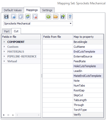 A list of "Fields in file" is used for mapping the values from import data to part and cut properties during import. New fields can be added to a mapping set by either updating a mapping set from an open import file, or by creating items manually using the editor.