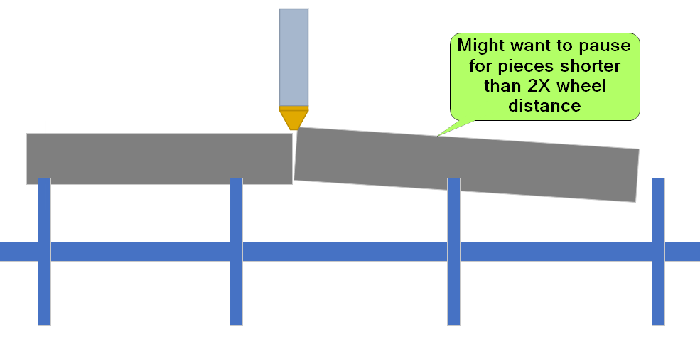 If this rocking is a concern, then set the Pause After Pieces Shorter Than to 2 times the distance between wheelsets. The rocking may still occur, but the machine will stop after the cut for you to check that everything is OK.