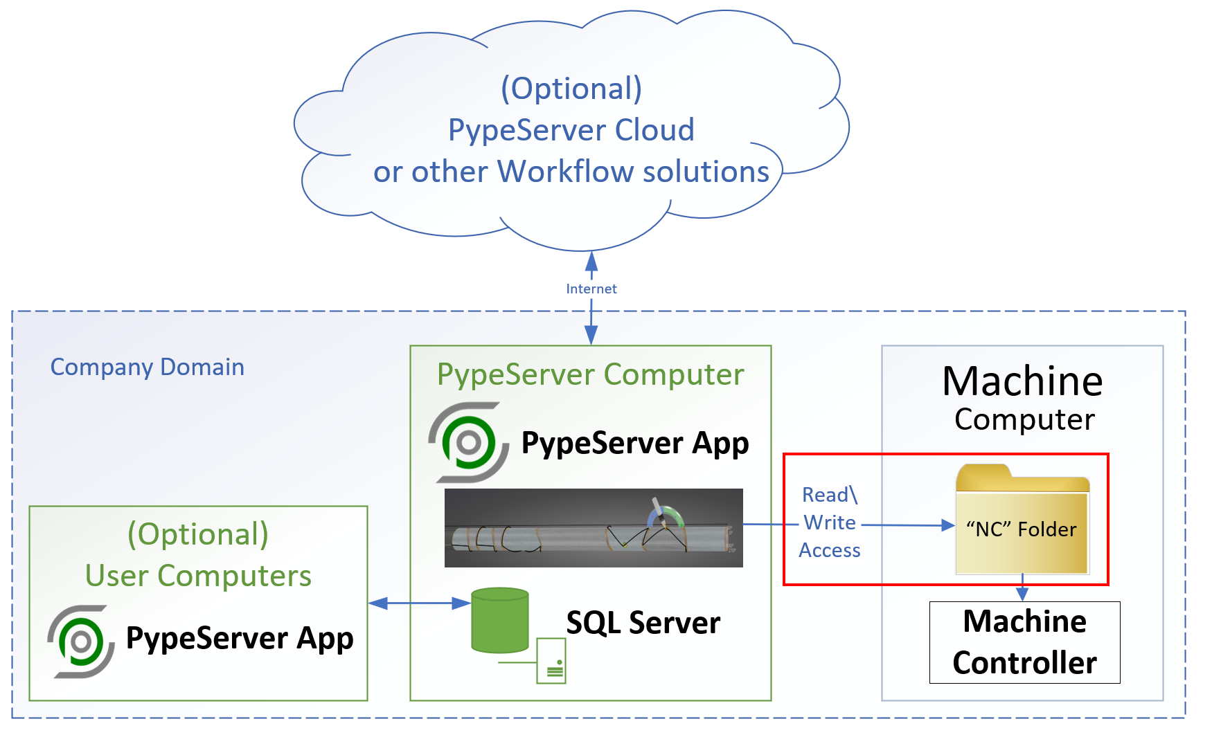 The diagram shows the overall topology of PypeServer products. The area in the red rectangle shows where PypeServer writes .xpi files out to a shared folder. These .xpi files are then loaded by the machine controller app (the NUM HMI). In this example the folder is on the actual Machine computer.