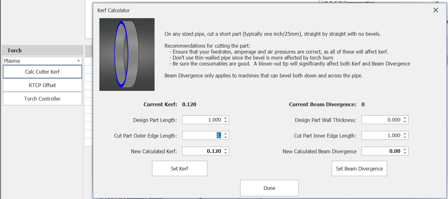 This tool will help you calculate the plasma kerf (cutter width) by cutting a sample part. It will also help you calculate torch beam divergence (see Beam Divergence in the Training docs). For straight cuts and thin-walled pipe, you do not need to change beam divergence. Beam Divergence should be set correctly if you are cutting steep bevels on thicker pipe.