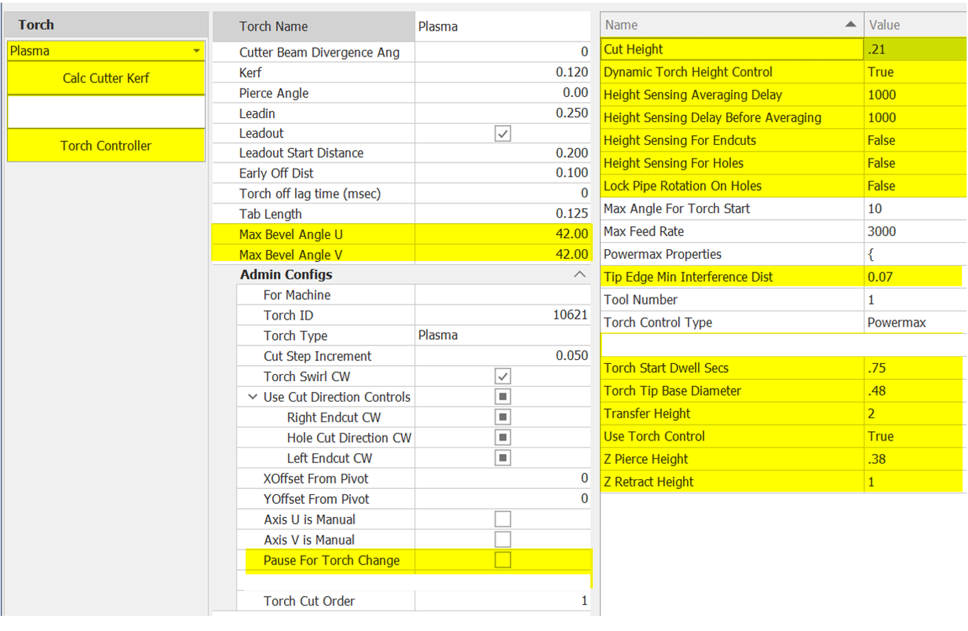 Set "Use Torch Control" to true to use the torch control data. When using torch control, part designers and machine operators can select cut processes for Parts and Pipe Nestings. These process selections will be looked up when creating .xpi files to replace various cut and torch settings such as feedrate, kerf, cut height, pierce height, and torch start dwell. Using torch controls is covered in other documentation (TBD).