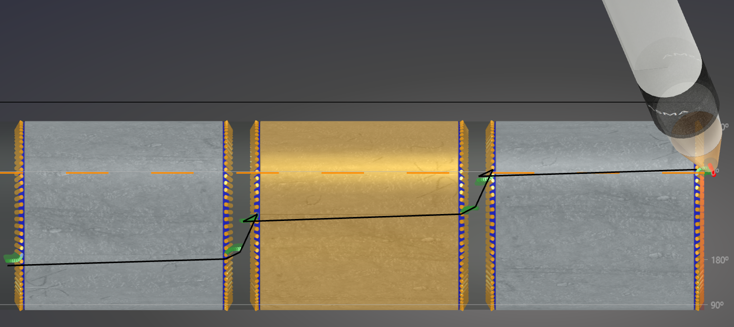 When straight cuts are nested together without any rotation between starts and finish, the leadins and leadouts can overlap and cause the torch to burn incorrectly (gap sideways), or fault as the leadin cut hits the previous cut's leadin and leadout gaps. This setting instructs PypeServer nesting to rotate the next part by a distance (around the pipe) so as to avoid this intersection. Shown below is a 4.5" pipe with StaggerStraightCutStartRotationDist = 1 inch.