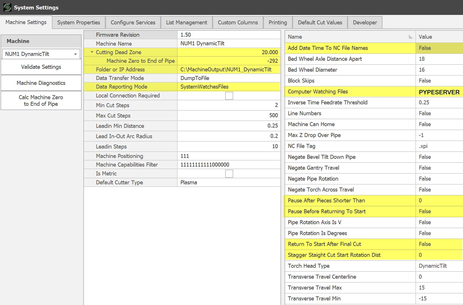 This section covers the settings in PypeServer that affect machine behavior via .xpi program files. The settings NOT highlighted are either set by PypeServer, or adjusted as needed per customer support. This dialog is opened through Settings ?? Machine Settings tab.