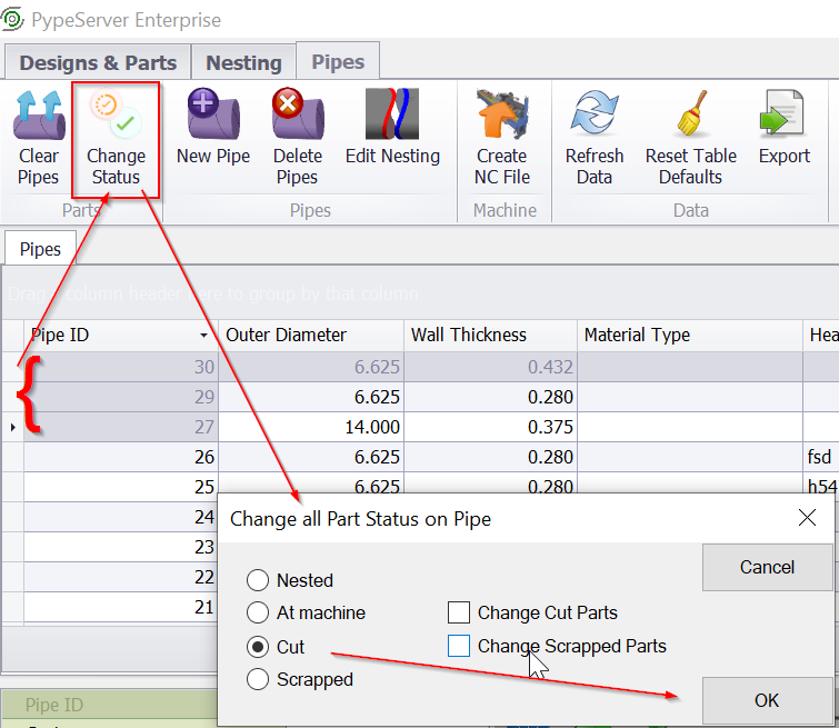 If this mode is selected, then the user can (should) maintain Scheduled Part cut status in PypeServer by selecting one or more pipes and selecting the Change Status button as shown here: