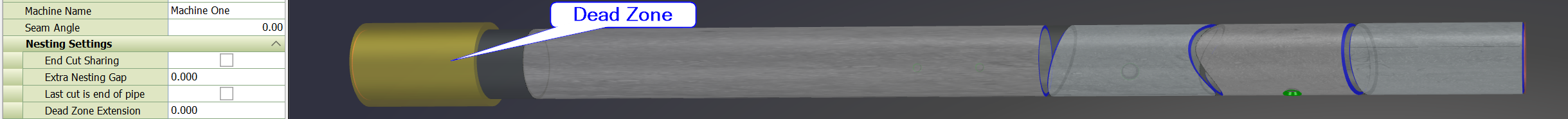 It is also possible to use the far end of the pipe as the final endcut of a part, thereby using the entire pipe. When using the far end of the pipe as the end of a part you STILL should have a dead-zone so that no cuts are placed in the dead-zone. Please see the section Last Cut on End of Pipe for more information.