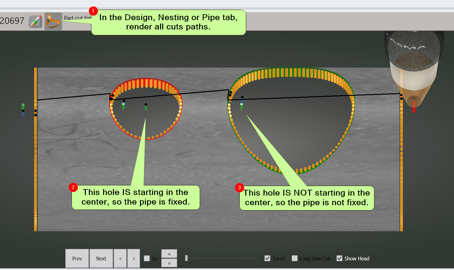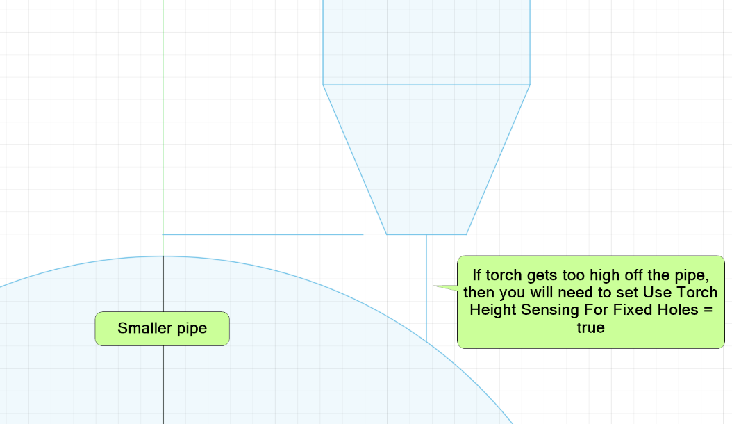 If you are cutting smaller pipe, the holes will wrap around the pipe such that the torch must follow the pipe height down Z to maintain a reasonable cut height.