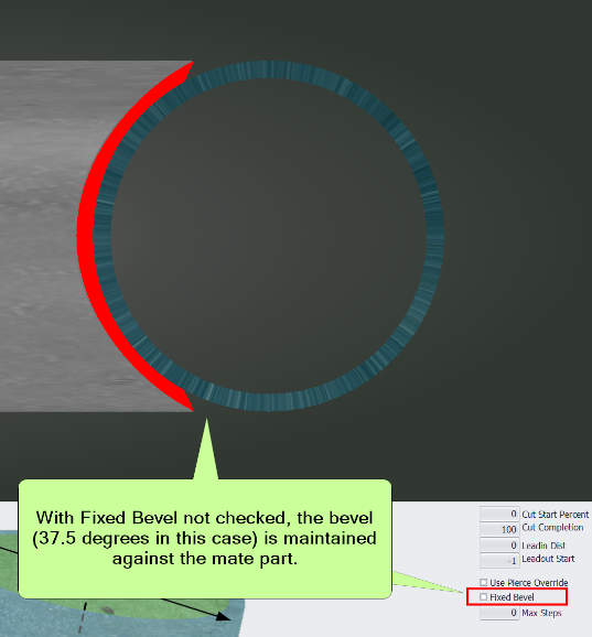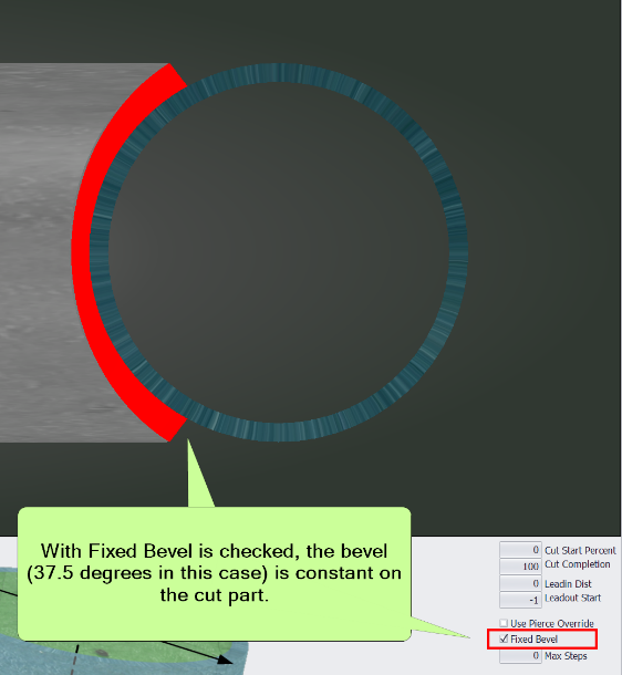 By checking the "Fixed Bevel" checkbox for a cut, the cut bevel will be maintained against the part being cut. This eliminates changes to the bevel in GCode, which results in a smoother cut.
