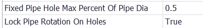 Fixed Pipe Hole Max Percent of Pipe Diameter provides the maximum hole size for locking/fixing the pipe and is calculated as Hole Diameter/Pipe Outer Diameter. E.g. with this set to .05, then for a 4" OD pipe, any hole 2" or smaller would be fixed. The pipe will rotate for holes larger than 2".