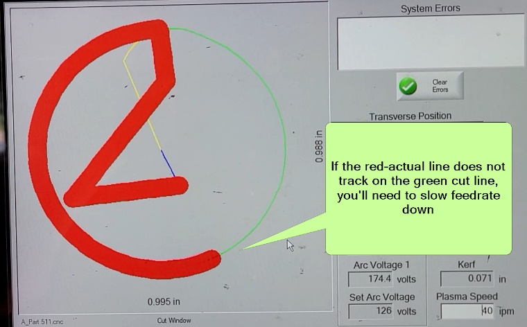 Phoenix to see if the actual cut path (in red) is following the planned cut path (in green). If the feedrate is too fast, the deviation is typically visible both on-screen and on the actual part.